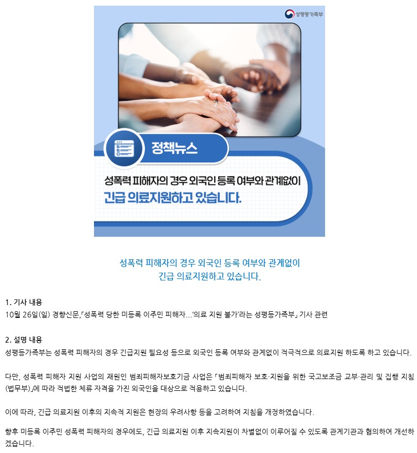 | 제목 | [관련자료] 성폭력 피해자의 경우 외국인 등록 여부와 관계없이 긴급 의료지원하고 있습니다. |