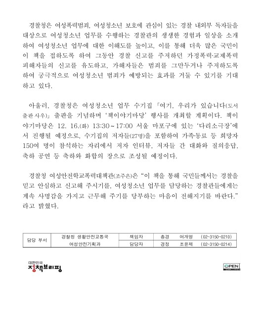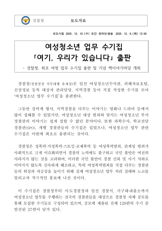 제목 [관련자료] 여성청소년 업무 수기집 「여기, 우리가 있습니다」 출판