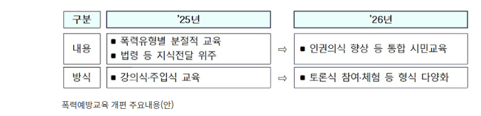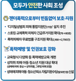◆ 모두가 안전한 사회 디지털성범죄로부터 모두를 빈틈없이 보호·지원하고자 중앙 디지털성범죄피해자지원센터 인력을 올해 33명에서 내년 43명으로 10명 늘리고, 불법촬영물등 탐지·삭제지원 시스템도 고도화한다. 지역 디지털성범죄피해자지원센터 인력을 확대해 상담, 법률·의료지원, 수사 동행 등 디지털성범죄 피해자 밀착지원을 강화한다. 또한 성평등가족부를 중심으로, 경찰 등 유관기관 간 상시협력체계를 구축해 유포 현황 심층분석-신속한 유통 차단-불법행위 강력 대응 등 디지털성범죄 피해에 대해 통합적으로 대응한다. 이를 위해 '(가칭) 디지털성범죄 피해 통합지원단' 설치도 관계부처와 협의를 거쳐 추진할 예정이다. 교제폭력 등 친밀관계 기반 폭력에 엄정 대응하는 바, 내년 상반기부터 반복 신고 등 재발 우려가 높은 위험군 피해자가 폭력위기에 다시 놓이지 않도록 위험수준에 따른 경찰과 가정폭력상담소 간 공동 모니터링 체계를 운영할 계획이다. 아울러 스토킹방지법 개정을 추진해 온라인 상 확산되는 스토킹피해 개인정보에 대해 디지털성범죄가 결합되지 않은 경우에도 삭제 지원할 수 있는 근거를 마련한다. 교제폭력·스토킹·가정폭력 피해자가 소송 대응 등 필요한 법적 서비스를 충분히 이용할 수 있도록 무료법률구조 사업도 예산을 올해 32억 원에서 내년 40억 원으로 늘려 확대한다. 한편 현재 성폭력·가정폭력·성매매 등 폭력 분야별로 법령 등 지식전달 위주로 이루어지고 있는 폭력예방교육은 통합·재조정해 교육 실효성을 강화해 나갈 계획이다. 이에 세부 개편방안을 논의할 자문단을 내년 2월까지 구성하고, 의견수렴 과정을 거쳐 하반기까지 '폭력예방교육 개편 방안'을 마련·확정한다.