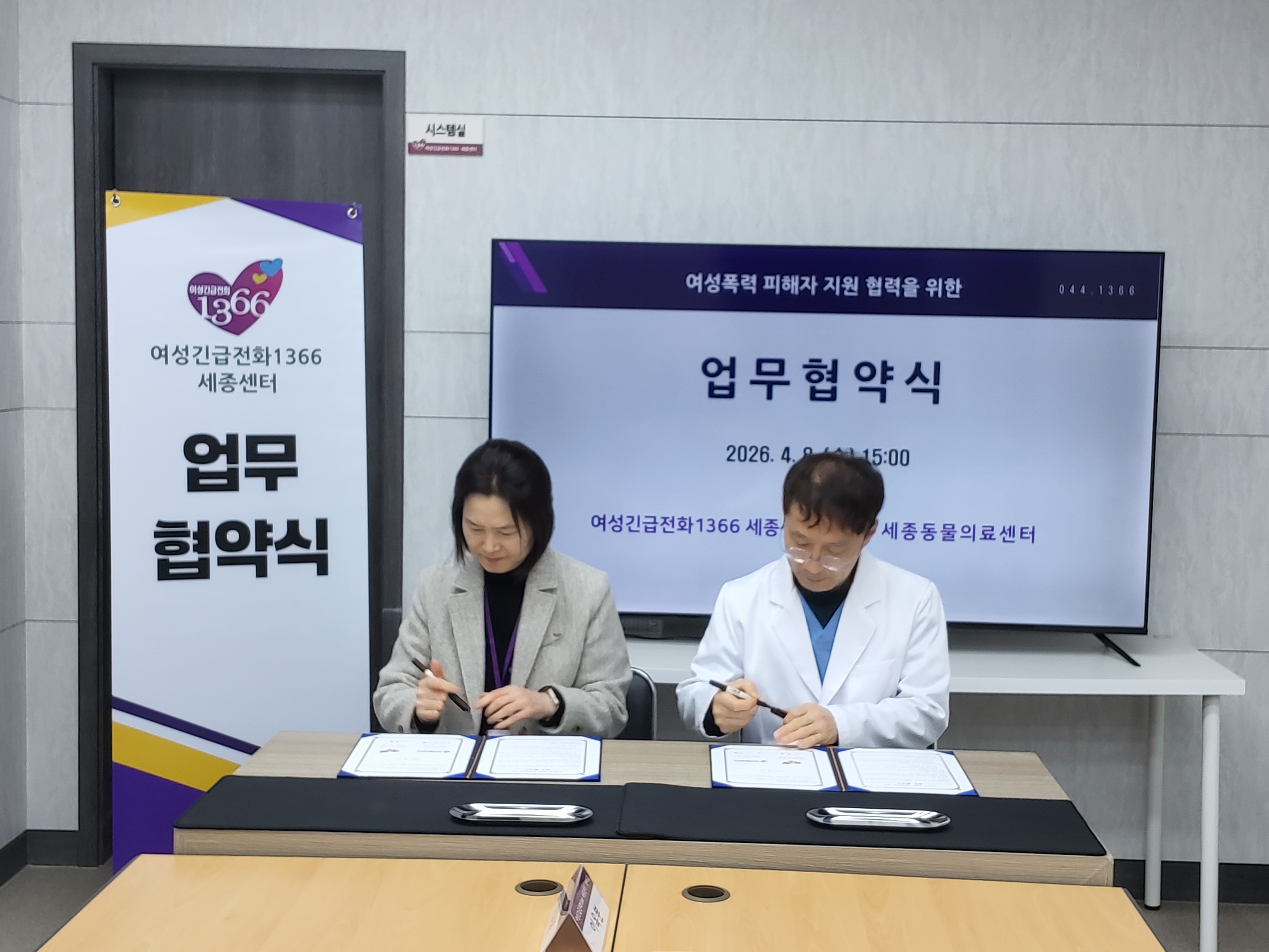 2026년 업무협약 및 간담회-세종동물의료센터 ▶ 날짜 : 2026. 4. 8.(수) ▶ 장소 : 여성긴급전화1366 세종센터 ▶ 내용 - 여성긴급전화1366 세종센터–세종동물의료센터 업무협약 체결 - 긴급피난처 입소 피해자 반려동물 대상 펫 호텔링 및 건강검진 지원체계 구축 - 반려동물로 인한 보호시설 이용 제한 해소 및 피해자 보호·회복을 위한 협력 강화