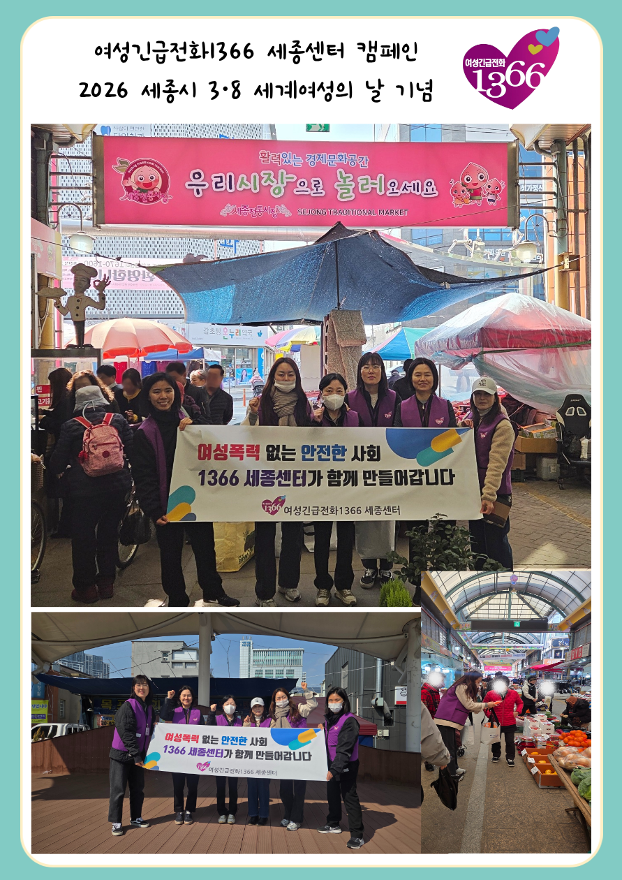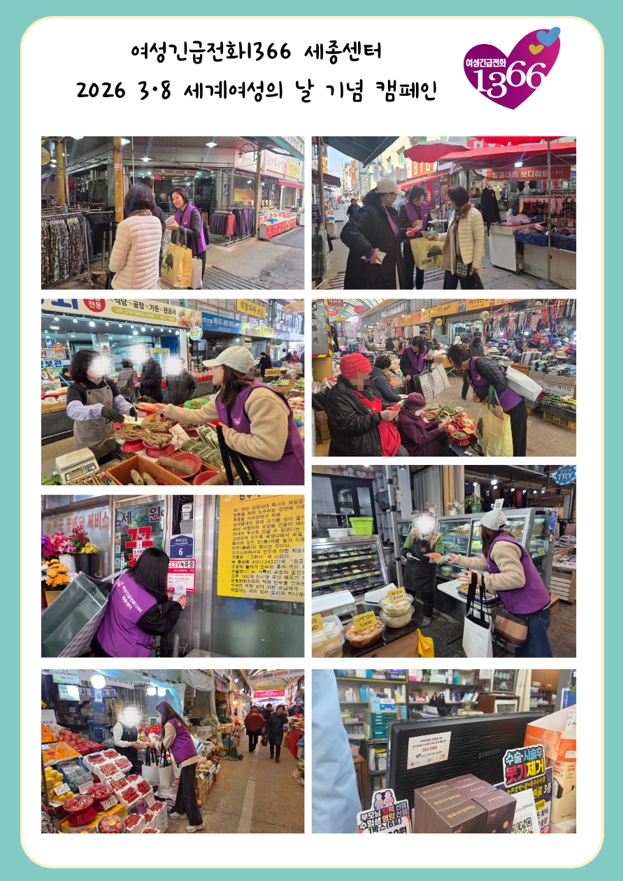 세종여성긴급전화1366 세종센터는 3·8 세계여성의 날을 맞아 세종시 조치원읍 세종전통시장에서 시민과 시장 상인을 대상으로 여성폭력 예방 홍보 캠페인을 진행했습니다.