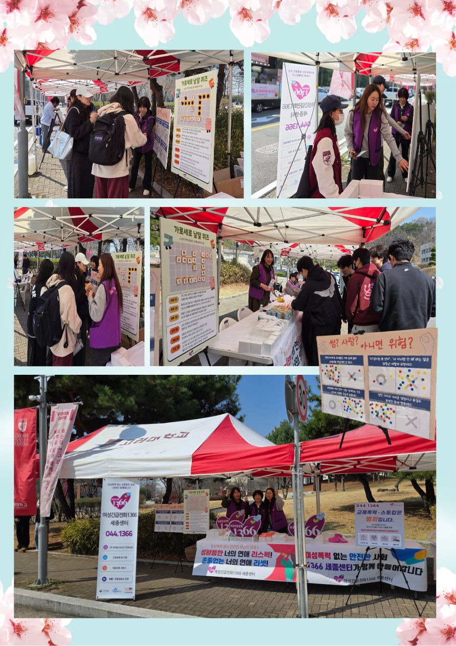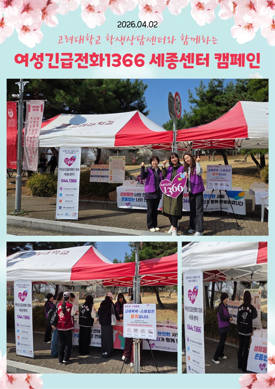 교제폭력 및 스토킹예방 캠페인 - 일 시 : 2026. 4. 02.(목) 10:00~16:00 - 장 소 : 고려대학교 중앙광장 - 내 용 : 대학생 대상 교제폭력 및 스토킹 범죄예방 인식 개선 및 기관 홍보